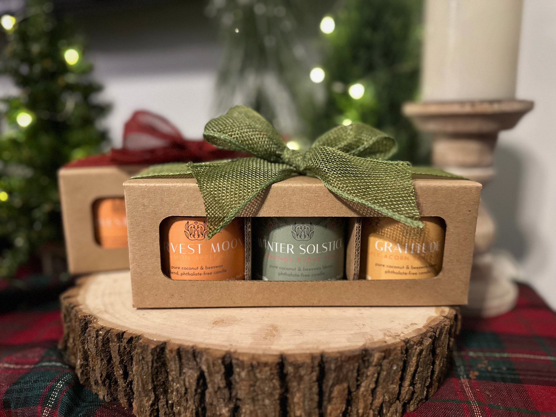 3-pack Holiday Gift box includes 3-3.6 oz candles in Harvest Moon, Gratitude, and Winter Solstice. Add on matches & Wick trimmers for an additional $6
