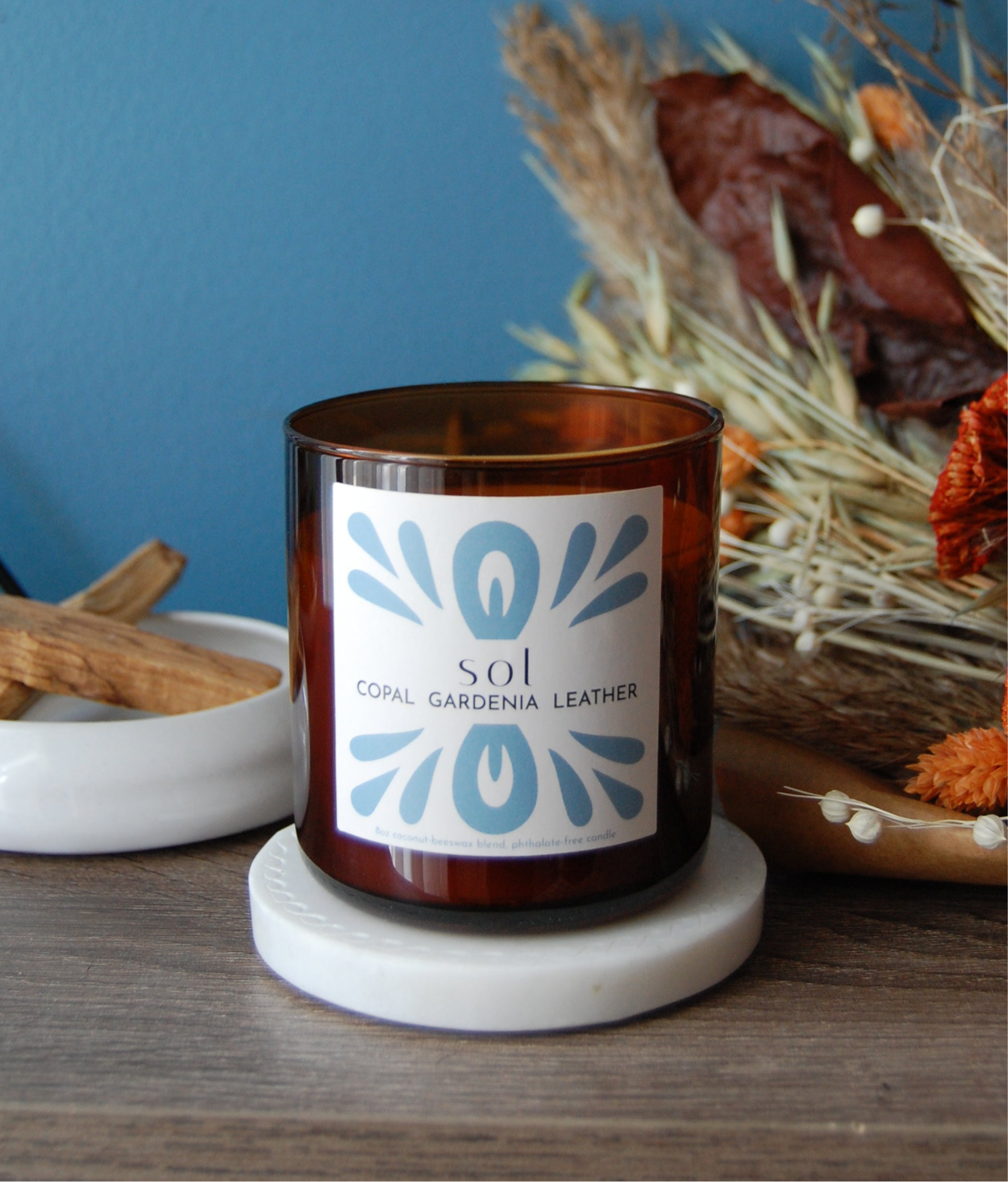 Sol is a soulful blend of sacred copal, velvety gardenia, orange blossom, rich leather, and bright bergamot. Together, they create a scent that feels grounding yet radiant—like sunlight woven with strength and hope.